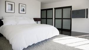 This apartment with nice shades of blue and a beautiful bathroom will help you to relax after work.