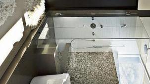 This apartment with nice shades of blue and a beautiful bathroom will help you to relax after work.